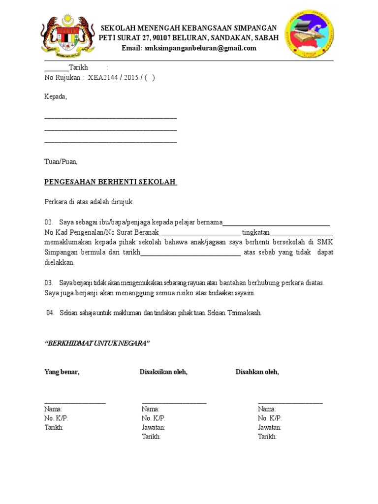 Menghantar surat kepada pihak sekolah melalui guru kelas untuk tujuan rujukan. Surat rasmi mohon berhenti sekolah kedinasan surat rasmi mohon berhenti. Namun sebagai orang tua maka memiliki hak juga untuk mengetahui anaknya sekolah dimana.